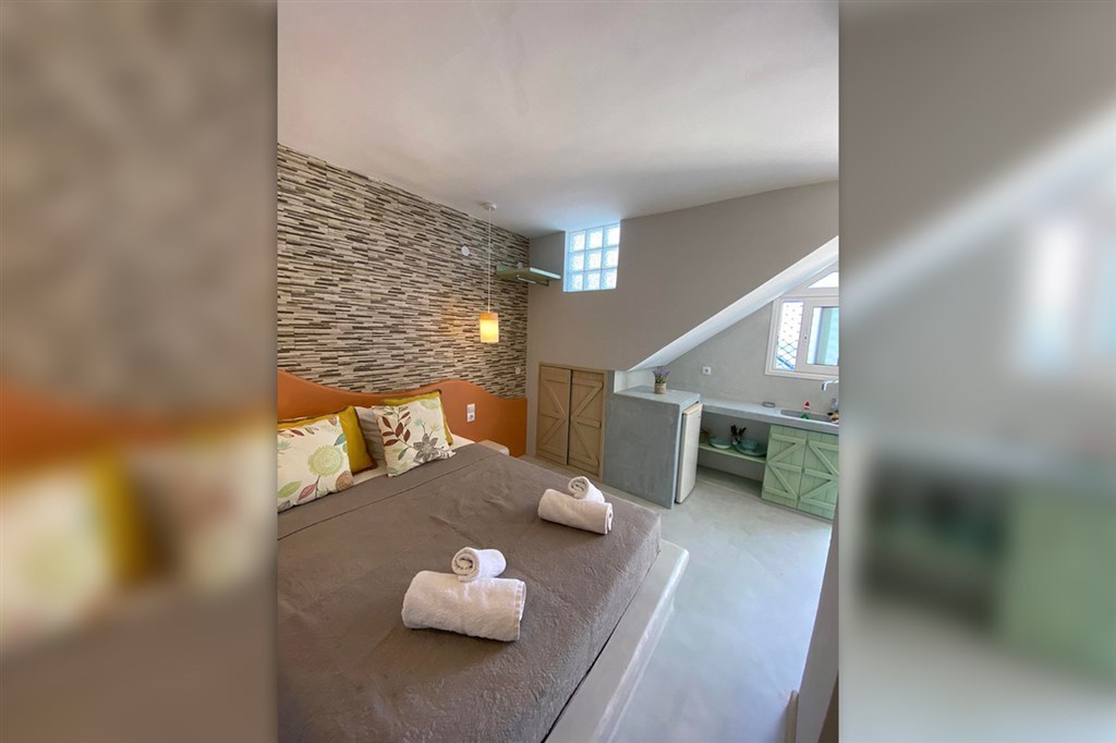 Dvoulůžková studia s výhledem na moře (max. obsazenost 2 dospělé osoby), klimatizace (5 €/den), lednice, TV/SAT, Wi-Fi, zařízený kuchyňský kout, koupelna, balkon nebo terasa.